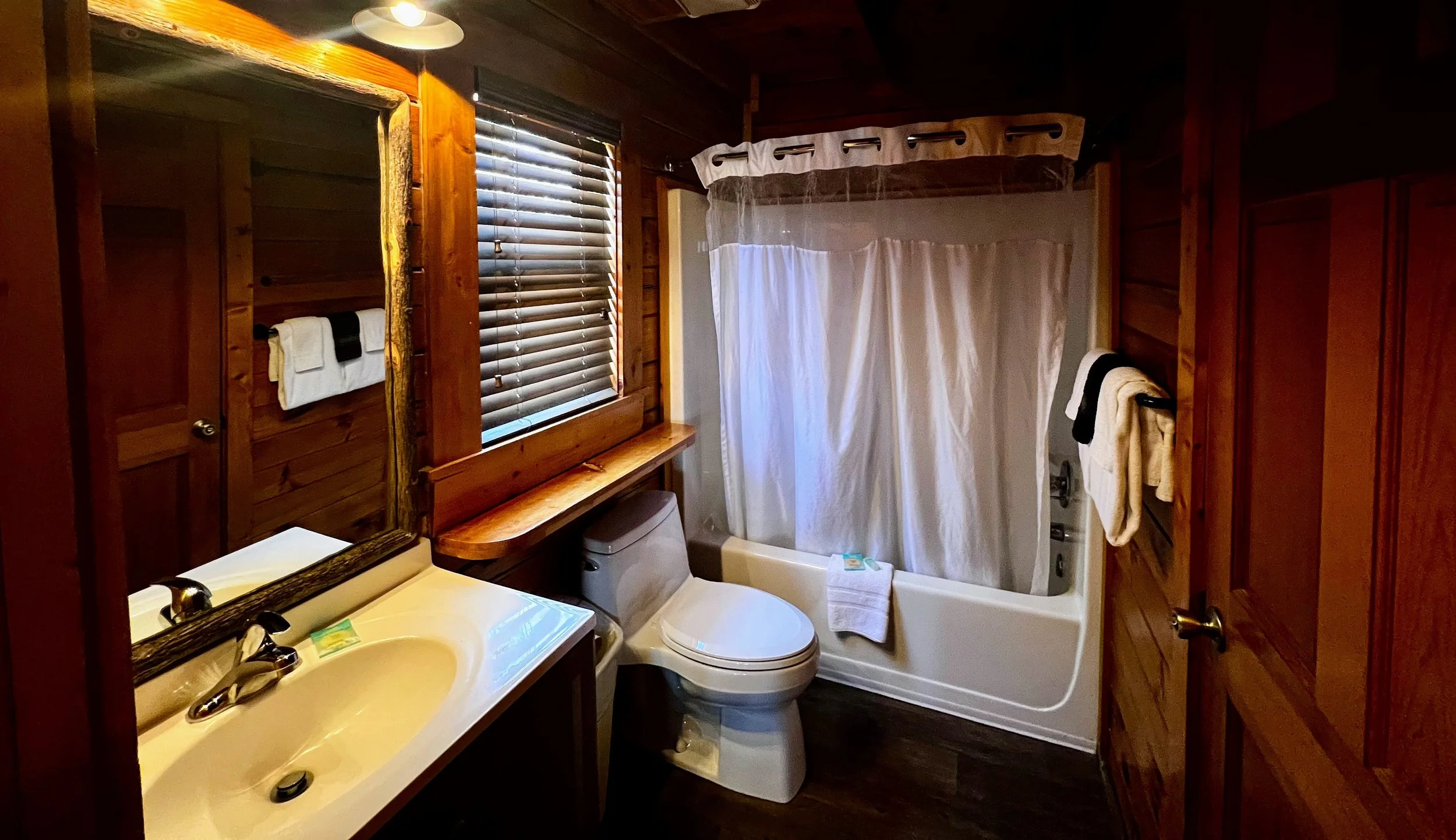 All Private Cabins include: full kitchen, living room with a rock fireplace, satellite television, front and back porches, as well as necessities such as linens and towels. Most cabins have wireless internet.